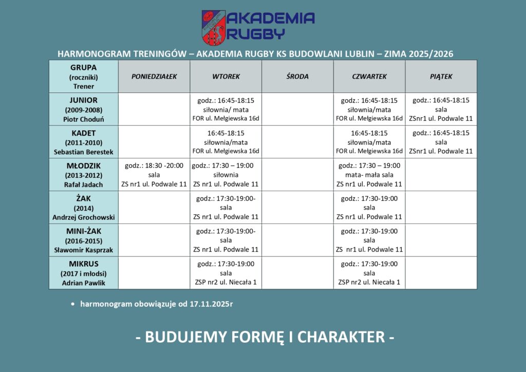Prezentujemy harmonogram zimowych treningów Akademii Rugby KS Budowlani Lublin, a poza tym: